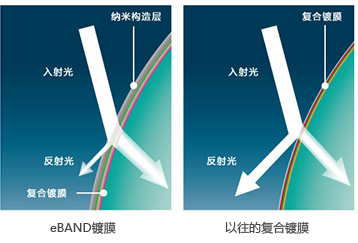 eBAND(擴(kuò)展頻寬防反射)鍍膜將比可見光波長(zhǎng)更小的細(xì)微納米構(gòu)造體形成的納米結(jié)構(gòu)層(1nm=1/1,000,000mm)覆蓋在復(fù)合鍍膜的表面的新型技術(shù)。