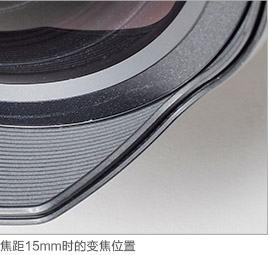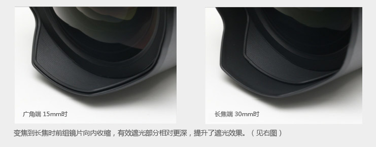 采用了特殊的光學(xué)構(gòu)造,當(dāng)從15mm變焦到30mm時(shí)前組鏡片做倒退運(yùn)動(dòng),即使在30mm端,鏡頭遮光罩也可有效遮光。