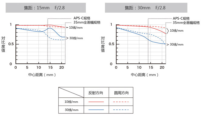 MTF曲線圖中的10線/mm(低周波)的曲線越接近1說明鏡頭的再現(xiàn)性、通透性就越好。而30線/mm(高周波)曲線越接近于1,則表示鏡頭的解像性越敏銳。隨著畫面的放射方向(實(shí)線)和圓周方向(虛線)的走向,弧線彎曲也會(huì)出現(xiàn)差別。