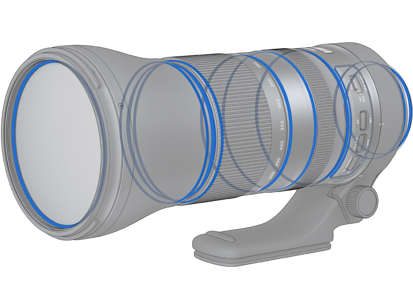 SP 150-600mm G2(型號(hào)A022)采用了13組21片的鏡片構(gòu)成。在前款鏡頭SP 150-600mm(型號(hào)A011)的光學(xué)設(shè)計(jì)上進(jìn)行了全焦點(diǎn)區(qū)域性能上的大幅提升。同時(shí),采用了3片和型號(hào)A011相同的LD低色散鏡片,將軸向色差和放大色差控制在低限度。同時(shí),呈現(xiàn)高畫(huà)質(zhì)表現(xiàn)不可或缺的還有eBAND擴(kuò)展頻寬多角度抗反射鍍膜,大幅控制造成眩光和鬼影的光反射,實(shí)現(xiàn)通透清澈的成像效果。