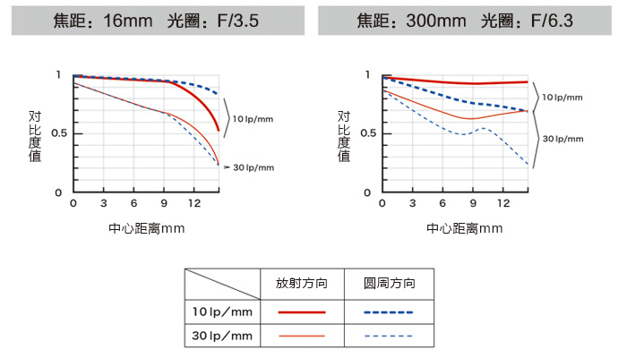 隨著畫面的放射方向(實線)和圓周方向(虛線)的走向,弧線彎曲也會出現(xiàn)差別。而為了獲得解像敏銳、使畫面整體效果出色的優(yōu)越性能,取得各曲線之間的平衡至關重要。