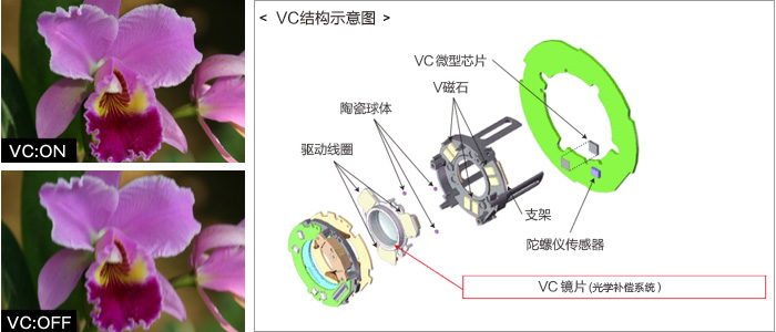 | 騰龍獨有的VC (Vibration Compensation)防抖技術,采用3組驅(qū)動線圈,通過3個陶瓷球以電磁驅(qū)動方式控制補償鏡片(VC鏡片),由于VC鏡片僅與陶瓷球接觸,摩擦更小更平穩(wěn)。即使是在低照明環(huán)境下或是遠距離拍攝,取景器畫面仍能保持穩(wěn)定性和出色的追蹤性。 |